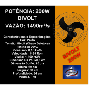 Ventilador Oscilante de Parede Vent New 60cm Bivolt 200w Grade Aço Preto Código 00109