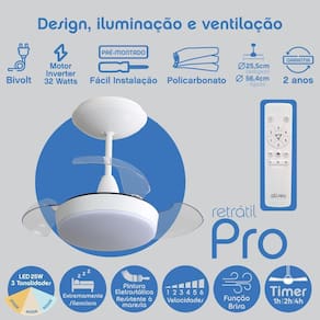 Ventilador De Teto Aliseu Retrátil Pro Branco Ventilador Aliseu Retrátil Pro, o modelo retrátil agora em uma versão mais compacta. Ele se transforma em uma linda luminária de decoração quando desligado, ficando com apenas 25,5 cm de diâmetro. Mesmo em funcionamento, chega aos 56,4 cm de diâmetro, sendo ideal para qualquer ambiente mais reduzido. Altura com haste padrão: 33 cm Diâmetro desligado: 25,5 cm Diâmetro ligado: 56,4 cm Peso liquido: 2,6 kg Área de ventilação: 20 m2 Rotação máxima: 406 RPM Número de pás: 3 Material das Pás: Policarbonato Voltagem: Bivolt Potência do Motor: 32 Watts Iluminação: LED Níveis de velocidade: 6 Acionamento: Controle remoto : 24 meses Marca: Não Informado Ean: 7898140449550