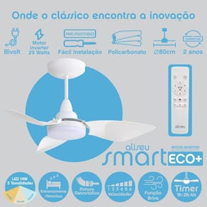 Ventilador de teto aliseu smart eco+ Com motor inverter, controle remoto, bivolt, led integrado e muito mais A melhor ventilação da categoria Com apenas 80 cm de diâmetro, o ventilador de teto aliseu smart eco+ é ideal para qualquer ambiente. Possui uma ótima ventilação, além de não gerar ruídos. Já vem pré-montado e com protetor térmico no motor, garantindo mais segurança e durabilidade. Além de tudo isso, o ventilador de teto aliseu smart possui uma de 02 anos. Características técnicas: Acionamento: controle remoto que controla as velocidades, sentido de giro ventilação ou exaustão , acendimento da luminária e tem função timer no controle remoto Rotação máxima: 456 rpm Diâmetro: 80 cm Número de pás: 3 Vazão máxima de ar: 1,81 m/s Área de ventilação sugerida: 20 m Voltagem: bivolt Potência do motor: 130 watts Iluminação: luminária led integrada com 3 tonalidades; 15w Compre com quem entende de ventilação Fundada em 1998, através da aquisição da unidade de ventiladores da singer, a aliseu tecnologia é uma empresa dedicada ao mercado de ventiladores de teto. Seu foco está na qualidade, no design e na tecnologia dos seus produtos, fato que pode ser confirmado pelos prêmios já recebidos, entre eles um de design de produto na feira industrial de hannover e pelo premio selo procel. A aliseu se destaca pelo alto padrão de qualidade e pelo seu extenso portfólio, que hoje conta com modelos que se adaptam as mais diversas necessidades. Atualmente, a aliseu tem foco em continuar desenvolvendo produtos com as melhores tecnologias e que atendam às necessidades dos seus consumidores. Marca: Não Informado