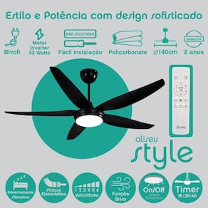 Com 140cm de diâmetro e motor supereficiente com selo Procel do Inmetro, o ventilador Style entraga o máximo em desempenho. Possui uma luminária LED integrada de 3 tonalidades, proporcionando ainda mais economia.