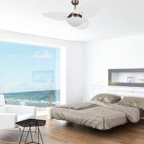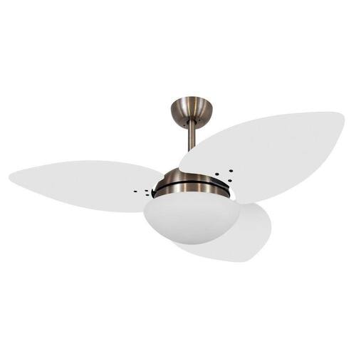 Especificação técnica: Marca: Volare Modelo: VD42 Dunamis S3 Quantidade de Pás: 3 Estrutura das Pás: Pás em MDF laqueada Cor das Pás: Branco Corpo: Bronze Voltagem: 127v ou 220v Acionamento: Controle de parede (opcional controle remoto vendido separadamente) Número de Velocidades: 3 Potência do Motor: 120w Frequência: 60Hz RPM do Motor: 404 Área de Vazão: 2,62 m/s Selo Procel (Economia de Energia): A Soquete de Lâmpada: 2 x E27 Luminária: Vidro Acetinado com Acabamento Fosco Ajuste de altura: Não Silencioso: Sim Função Exaustão e Ventilação: Sim Dimensões do ventilador: 48cm de altura x 120 de diâmetro