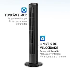 Conta com 3 velocidades e 3 modos de ventilação que se ajustam facilmente às suas preferências, proporcionando o nível ideal de frescor em qualquer hora do dia. A oscilação horizontal distribui o ar de forma uniforme no ambiente, enquanto o baixo nível de ruído proporciona mais conforto, especialmente durante o sono. Leve e portátil, o Air Tower é perfeito para te acompanhar aonde for. Saiba mais sobre o VTR-01-B Mondial:
