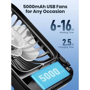 - Desempenho de resfriamento poderoso e eficiente: equipado com uma bateria recarregável de 5000mAh de alta capacidade, mantenha-se fresco o dia todo com até 6 a 16 horas de operação contínua com uma única carga completa. Suas configurações de 4 velocidades e design de 5 lâminas fornecem resfriamento poderoso e silencioso, tornando-o perfeito para escritórios, residências e aventuras ao ar livre
