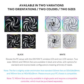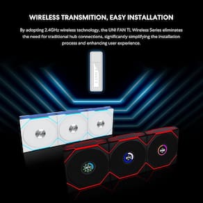 - Controle sem fio de 2,4 GHz: experimente a liberdade do verdadeiro controle sem fio com UNI FAN TL LED WIRELESS e TL LCD WIRELESS. Com tecnologia sem fio avançada de 2,4 GHz, esses ventiladores eliminam a bagunça de cabos enquanto gerenciam perfeitamente a velocidade do ventilador, iluminação RGB e até mesmo uma tela LCD.