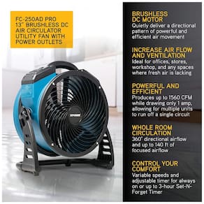 O ventilador industrial XPOWER FC-250AD é equipado com motor brushless DC avançado, proporcionando alto desempenho com baixo consumo de energia, operando com apenas 1 ampere mesmo em potência máxima. Gera um fluxo de ar de até 1560 CFM (aproximadamente 44,2 metros cúbicos por minuto), ideal para ventilação eficiente em ambientes internos como residências, escritórios e pequenos espaços industriais. Oferece controle de velocidade variável para ajuste preciso do fluxo de ar conforme a necessidade, além de timer programável de 3 horas para desligamento automático. Possui design robusto com grelha em espiral exclusiva e tecnologia Air Fin para fluxo de ar focado e estendido, alcançando até 43 metros de distância. A base permite rotação de 360° para ajuste do ângulo do fluxo. Conta com duas tomadas integradas (daisy chain) para uso simultâneo de múltiplos aparelhos no mesmo circuito. Portátil, possui alça para transporte e cabo revestido resistente. Produto certificado ET e CETL.