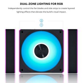 - Zonas de iluminação personalizáveis: possui duas zonas de luz distintas para efeitos visuais personalizados. A zona 1 ilumina as pás do ventilador para uma aparência impressionante. A Zona 2 oferece um brilho suave com iluminação difusa em ambos os lados do ventilador.