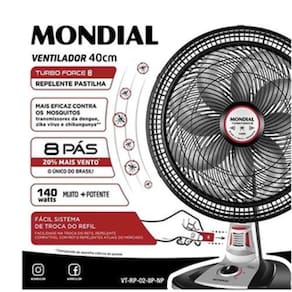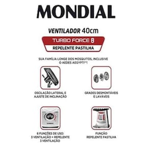 Mobilar eletro há mais de 25 anos inovando em produtos e atendimento ventilador mondial turbo 40cm 8 pas, silencioso mais potente repelente pastilha Função repelente pastilha, baixo consumo de energia, hélice de 40 cm com 8 pás, mais eficaz contra os mosquitos transmissores da dengue, zika vírus e chikungunya Grande vazão de arBaixo consumo de energiaMais eficaz contra os mosquitos transmissores da dengue, zika vírus e chikungunyaHélice de 40 cm com 8 pásOscilanteInclinação regulávelGrade segura e removível para limpeza Potência: 140wConsumo: 0,14kw/hOrigem: nacionalGarantia: 12 mesesMaterial: pp