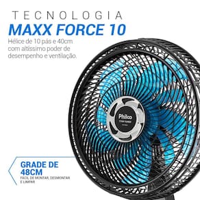 Com 174W de potência e a exclusiva tecnologia Maxx Force, ele oferece um fluxo de ar intenso e constante, graças à sua hélice de 10 pás com 40cm de diâmetro.