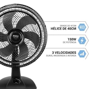 Marca: Philco Modelo: PVT41A Voltagem: 127V e 220V (Escolher no ato da compra) Tipo: Ventilador 2 em 1 (Mesa e Coluna) Potência: 150W Tecnologia: Maxx Force Velocidades: 3 níveis de intensidade (mínima, média e máxima) Diâmetro da hélice: 40 cm Oscilação automática lateral Inclinação regulável Consumo: 0,15 kWh Material: Plástico resistente e de fácil limpeza Níveis de velocidade: 3 Base: larga e estável