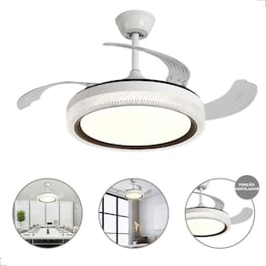 Tensão: 100-240V Área de ventilação: 20m RPM: 230 Diâmetro desligado: 460mm Diâmetro ligado: 1060mm Número de pás: 4 Frequência: 50-60Hz Fator de potência: 0.5 Corrente elétrica: 0.16A Potência do ventilador: Máx. 30W Potência do LED: 30W Temperatura de cor: 3000K - Branco Quente/ 4000K - Branco Neutro/ 6500K - Branco Frio Cor: Branco Fluxo luminoso: 3000lm IRC: 80 Controle Remoto Incluso Ean: 7898696185605