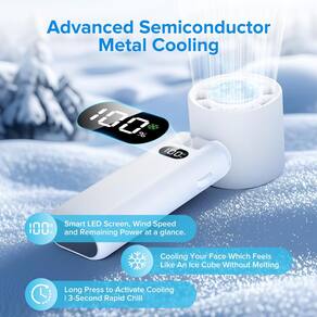 - Ventilador portátil de refrigeração semicondutora: Pressione o botão para ativar o resfriamento do semicondutor - A placa de resfriamento de alumínio de nível aeronáutico conduz instantaneamente energia termoelétrica, criando uma zona de núcleo de gelo de 11,7 °C que bloqueia o calor facial por meio da tecnologia de microcondensação.