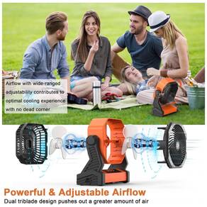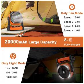 Bateria Recarregável de 20000 mAh: Equipado com uma potente bateria recarregável de 20000 mAh, esse ventilador oferece até 100 horas de uso contínuo. Pode ser totalmente carregado em 8-9 horas com entrada de 5V/3A através do cabo tipo-C incluso. Possui uma porta de entrada/saída tipo-C de 5V/3A e uma saída USB de 5V/2A, ideal para carregar o ventilador ou outros dispositivos, sendo o aliado perfeito para acampamentos, quedas de energia, furacões e muito mais.