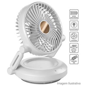 Especificações técnicas; . Fabricado em Plástico ABS . Carregamento USB . Base Giratória 180 . Anel de LED 3000k . 3 Níveis de Velocidade . Hastes ajustáveis e dobráveis . Tamanho Área ventilada 16cm . Tamanho dobrado: 18cm x 16cm . Tamanho expandido: 18cm x 26cm . Carregamento USB tipo C . Entrada carregamento 5v . Bateria 2400mAh . Peso 576grs
