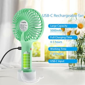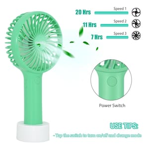 - ???3 velocidades, tamanho pequeno, mas poderoso?O motor potente embutido fornece um fluxo de ar forte e frio em 3 velocidades diferentes, permitindo que você escolha a velocidade de vento apropriada conforme desejar. O tempo de trabalho de Velocidade 1:20 horas, Velocidade 2:11 horas, Velocidade 3:7 horas. Um parceiro perfeito em um verão tão quente para mantê-lo fresco ao viajar, trabalhar ou praticar esportes