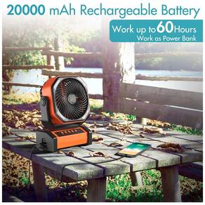 Este ventilador USB com uma bateria recarregável integrada de 20000mAh (NÃO SUBSTITUÍVEL) garante até 60 horas de funcionamento contínuo. Com 4 indicadores de bateria para monitorar o nível de energia restante, este ventilador também possui 2 portas USB (entrada USB-C e saída USB-A), permitindo que funcione como um dispositivo de carregamento para outros aparelhos. Ideal para camping, viagens, passeios ao ar livre, emergências em casos de furacões, tempestades, ondas de calor ou quedas de energia.