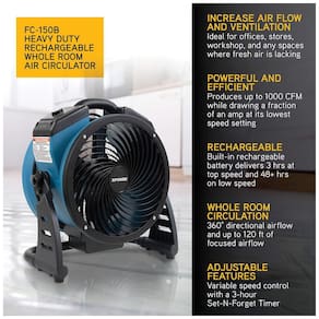 O ventilador portátil XPOWER FC-150B possui bateria recarregável de íon de lítio com capacidade de 67 watts-hora, permitindo uso contínuo por até 30 horas. Equipado com motor brushless DC de alta eficiência, oferece fluxo de ar máximo de 1000 CFM (aproximadamente 28,3 metros cúbicos por minuto), ideal para circulação de ar em ambientes residenciais, comerciais e de escritório, sem depender de tomadas. Conta com controle de velocidade variável em três níveis, timer programável de 3 horas, e design compacto com alça para transporte. A grelha em espiral direciona o fluxo de ar de forma focada para distâncias maiores, incluindo rotação de 360° para ajuste do ângulo do vento. O acabamento é em plástico com pintura em pó (powder coated), garantindo leveza e durabilidade. Sistema de carregamento via cabo e indicador LED de carga da bateria auxiliam no monitoramento do uso. Produto certificado CETL e atende as normas técnicas brasileiras, focado 100% em desempenho técnico e eficiência, sem menção a benefícios terapêuticos ou de saúde.