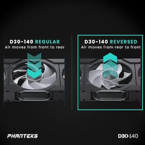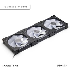 - A iluminação D-RGB é integrada e visível de todos os lados do ventilador D30-140. As lâminas refletem a luz proveniente do anel de iluminação Halos dentro da moldura. Compatível com placas-mãe equipadas com Digital-RGB e produtos Phanteks Digital-RGB.