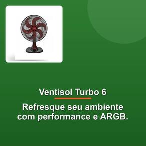 Redesenhado para maior estável e modernidade, o Ventisol Turbo 6 possui uma base e acabamento de grade arrojados. O controle na capa protetora do motor permite ajustes de três velocidades, otimizando seu nível de frescor. O sistema Wind-line na grade garante um fluxo de ar direcionado e potente, enquanto a funcionalidade de oscilação automática protege uma área maior.
