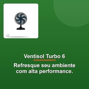 Sinta a brisa fresca e revitalizante do Ventilador de Mesa Ventisol Turbo 6, seu aliado perfeito para combater o calor e garantir momentos de conforto e relaxamento em casa. Com um design moderno e elegante, o Turbo 6 destaca-se por sua base robusta e grade com acabamento arrojado, além de oferecer uma ventilação potente e eficiente. Sua hélice de 6 pás com nova aerodinâmica, impulsionada por um motor turbo de alta performance, entrega um fluxo de ar intenso sem gerar excessivos ruídos.