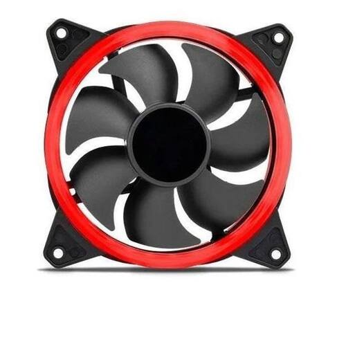 Duplo anel led vermelho; Ventoinha para gabinete gamer; Refrigerador de 12cm; Fácil e rápido de instalar; Baixo barulho 200ba ; Baixo consumo de energia 0.25a Poder de ventilação 1200-1725 rpm ; Longa duração 100.000 horas ; Dissipação alta de calor; Design para proteção de cabos; Conector 4 pinos ata para conexão em cascata.