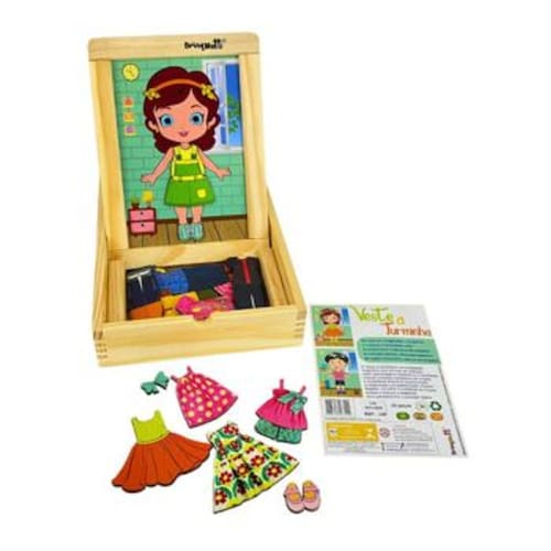 O Veste a Turminha é um brinquedo educativo magnético em madeira. Composto por 22 peças, o kit vem em uma caixa de madeira com tampa dupla face magnética, ilustrada com a imagem de um menino de um lado e uma menina do outro, formando o cenário perfeito para brincar. A tampa se encaixa no centro da caixa, servindo de suporte para que a criança possa vestir os personagens com roupas e acessórios magnéticos, criando diversas combinações.