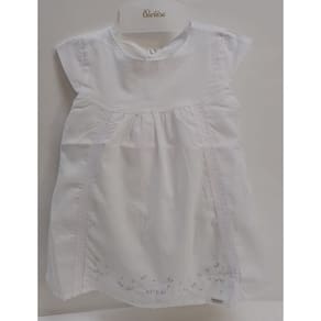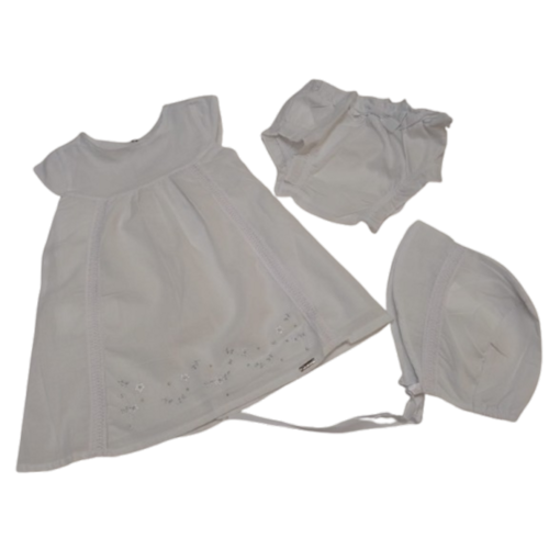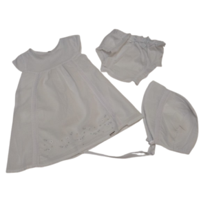 Características do Produto: - Vestido em tecido tricoline 100% algodão, super confortável, leve e macio. Na frente com detalhes de bordados super delicados, que dão um charme especial a peça. Na barra plaquinha da marca aplicada. drapeado que deixa a saia mais rodada. Forrinho interno que trás ainda mais conforto ao vestir. Abertura com botões de pressão nas costas. Simplesmente um encanto! - Chapeu também em tecido algodão. Com detalhes combinando ao vestido. Fita para amarrar. - Calcinha com detalhe de lacinho na frente. Elástico na cintura e nas perninhas.