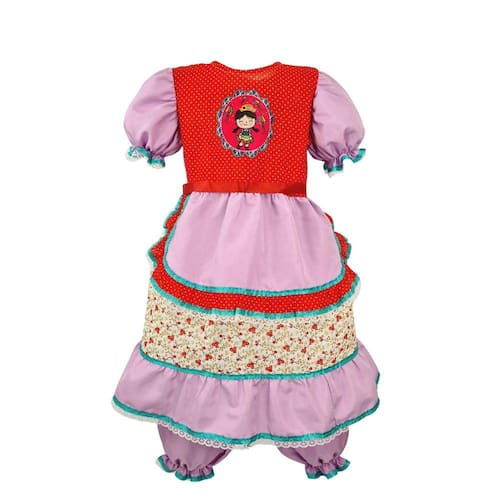 Os babados delicados na barra da saia proporcionam movimento e fluidez, tornando-o perfeito para dançar quadrilha.