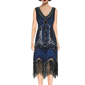 - Design: design listrado clássico dos anos 20 com detalhes de lantejoulas e miçangas para um padrão encantador. Design profundo com decote em V na frente e atrás; estilo colado ao corpo; comprimento midi; alças sem mangas e ajustáveis; totalmente forrado com lantejoulas e contas.