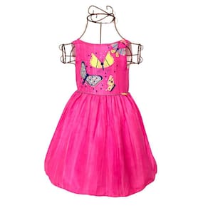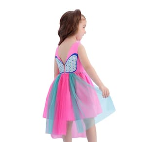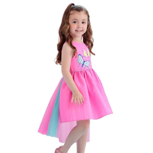Vestido produzido na temática de borboletas, com bordados na frente, cintura com detalhe de filete na cor lilás, saia com drapeado oferecendo mais volume, deixando mais rodadinho, nas costas abertura em zíper, com bordado nas costas de asa de borboleta, tule esvoaçante sobreposto, parecendo a cauda.