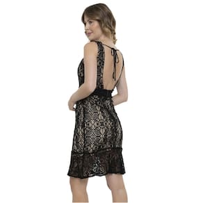 Vestido curto sem mangas. Confeccionado em renda, tecido moderno e elegante. Sem bojo, é decotado na parte frontal e posterior, possui detalhe em correntes no busto e amarração posterior. Acinturado e com babado, tem forro. Modelo versátil e confortável.