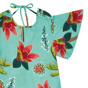 Flores, araras e coqueiros! O paraíso tropical em forma de vestido e beleza. O vestido na cor verde é confeccionado em tecido viscose, sendo perfeito para o dia a dia ou ocasiões especiais, seu detalhe é a amarração nas costas. É ou não é a cara do nosso paraíso brasileiro?\n