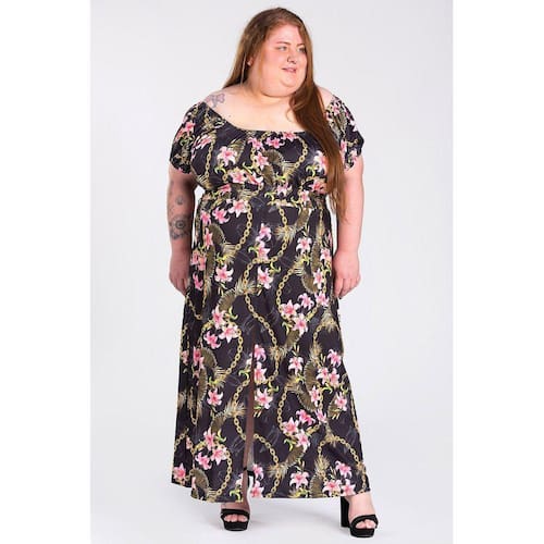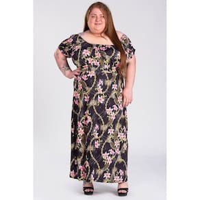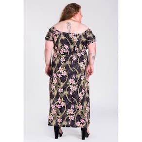 Vestido Feminino Plus Size Longo Ciganinha Estampado Malha Confort Detalhe Cintura Fenda Frontal