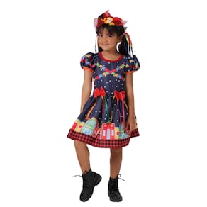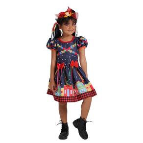 A festa da sua pequena vai ser com muita diversão é alegria, tudo perfeito para se torna um dia inesquecível com a fantasia para meninas que amam as festas de são joão. O vestido azul com lindas estampas tematicas, possui laços com fitilho na cintura e lindas mangas bufantes com babado. Para deixar ainda mais lindo e completo.