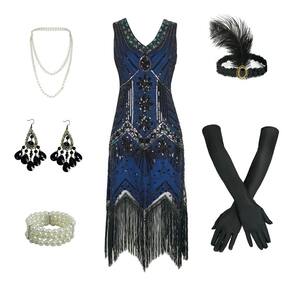 BONGZUO Vestido feminino estilo melindrosa anos 20, vintage, renda com franjas, Gatsby, conjunto de acessórios dos anos 20 (Z3722BU, GG)