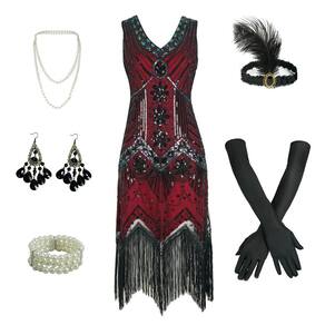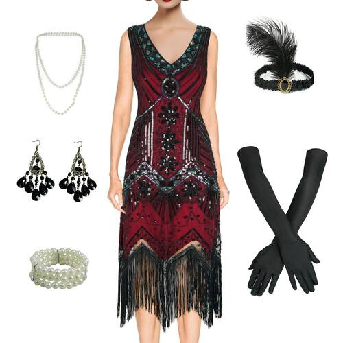 BONGZUO Vestido feminino estilo melindrosa anos 20, vintage, renda com franjas, Gatsby, conjunto de acessórios dos anos 20 (Z3722RD, 3GG)