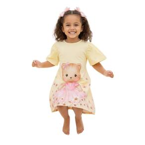 Vestido Infantil Amarelo com estampa de gatinha vestida de rosa, delicada e charmosa, perfeita para deixar o visual das meninas ainda mais alegre. O modelo conta com mangas borboleta amplas, que trazem leveza e sofisticação à peça.