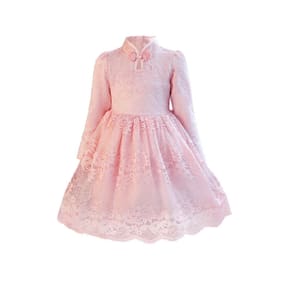 O vestido infantil de renda rosa é a escolha perfeita para as festas devido à sua elegância e charme. Com mangas longas, a peça oferece conforto e estilo para as pequenas fashionistas.