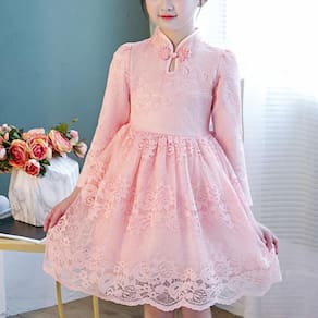 Vestido Infantil Renda Rosa Festas Manga Longa