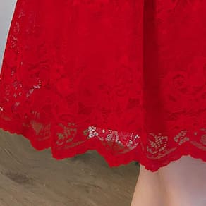 Com certeza, o vestido de renda vermelho de manga longa será um sucesso em qualquer festa!"