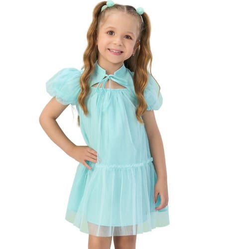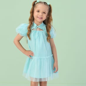 Vestido infantil manga curta todo em azul sobreposto em tule, simplesmente perfeito! Além de ser super confortável o vestido infantil é um charme e veste super bem.