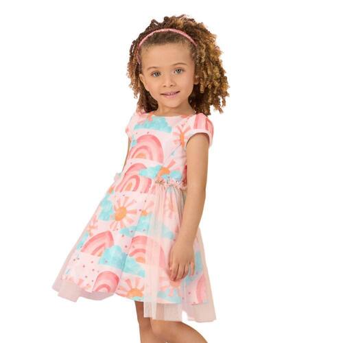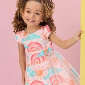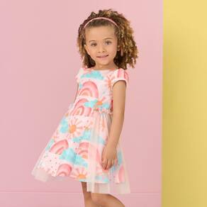Vestido todo colorido, com estampa de arco-íris e tule nas laterais. Além de ser super confortável o vestido infantil é um charme e veste super bem.