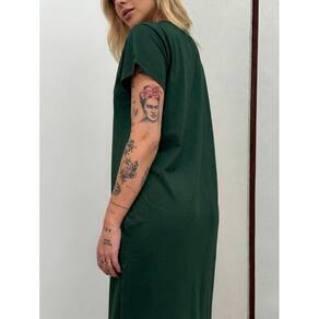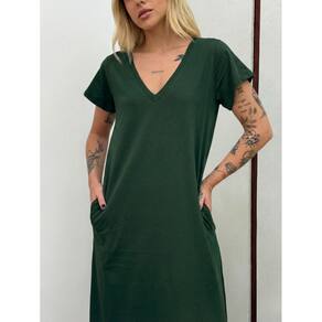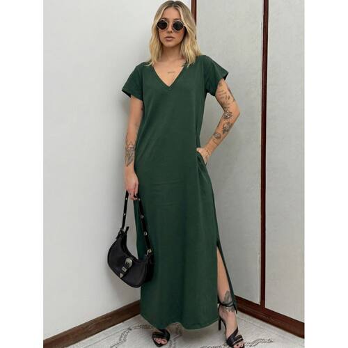 Vestido Longo de Algodão com Bolso Decote V Verde Escuro - Verde Musgo - P