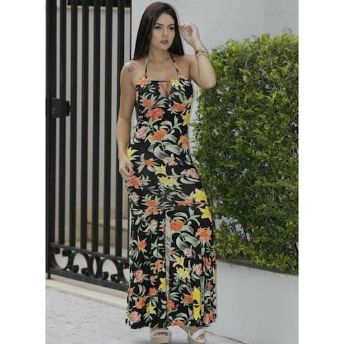 Vestido longo decote gota com fenda frontal. Estampado preto. Possui bojo. De amarrar no pescoço. Na parte posterior possui leve decote.