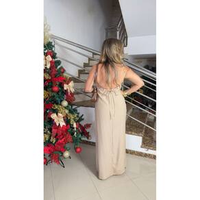 O vestido é um modelo longo e fluido, caracterizado pelo seu caimento leve e solto, ideal para proporcionar conforto e elegância em climas quentes ou eventos ao ar livre. Ele possui alças finas e um decote profundo nas costas com amarração ajustável, detalhes que conferem um toque delicado e feminino ao visual. Confeccionado em tecido leve, ele valoriza a silhueta de forma sutil. Marca: Não Informado