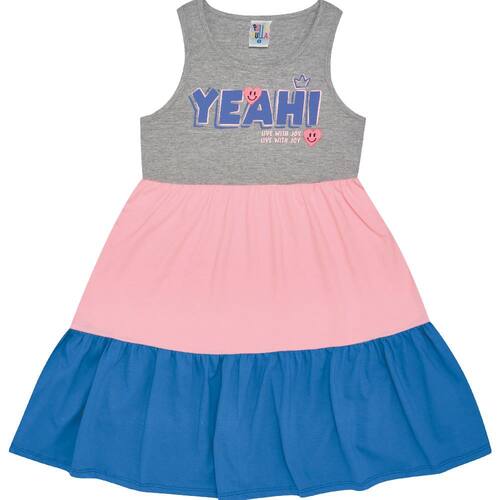 Um vestido a cara do verão com conforto, leveza e estilo. Confeccionado em Meia malha possuindo três cores Mescla cinza, Rosa e Roxo com a estampa “Viva com alegria Sim!” e detalhe de termocolante. Perfeita para os dias mais quentes, garantindo todo frescor e charme para a sua menininha.\n