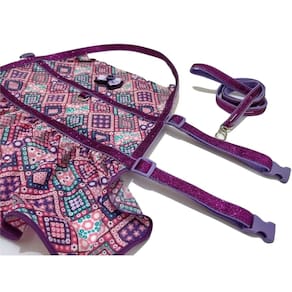 Tecido tricoline ou textoleen estampado na cor roxa ; Acabamento em viés roxa; Regulagem, fita de nylon com glitter roxo com presilhas de plastico; Laço na cor do vestido; Tamanho: GG Medidas aproximadas: 50 cm a 60 cm de circunferência abdominal, 48 cm de circunferência do pescoço, 36 cm de comprimento.