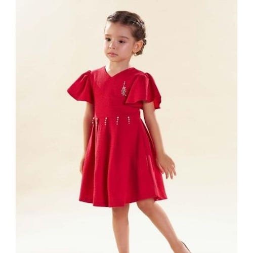 Vestido manga curta piquet com pregas, perolas e botões costas Kiki Xodó