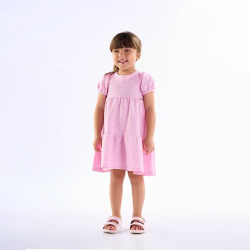 Movimento e conforto combinam com a sua pequena fashionista. Confeccionado em tecido malha corrente na cor chiclete, o vestido possuí decote arredondado, elástico nas mangas com pregas com efeito bufante leve. Ideal para curtir um dia no parquinho com a dinda favorita.