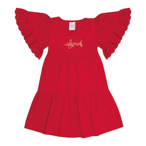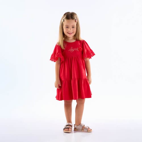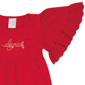 Nos dias quentes peças leves e fresquinhas são essenciais no guarda-roupa das pequenas. Aposte no vestido em cotton leve trabalhado na cor vermelha, possuí decote arredondado, renda em babado nas mangas, bordado central no peito com escrita "alegria" e aplique de flor. Uma fofura para o dia a dia e momentos especiais. *Sugestão de Look Natal