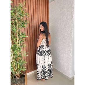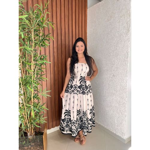 O vestido é longo, tomara que caia, com um design fluido e feminino. Possui fundo claro, em tom de branco ou bege suave, e é ricamente estampado com padrões florais e folhagens, com detalhes que contornam os desenhos. A estampa é distribuída em faixas horizontais ao longo do vestido, criando um visual harmonioso e tropical. O modelo tem um caimento leve, ideal para climas quentes, transmitindo frescor e elegância com um toque natural e sofisticado. Marca: Não Informado